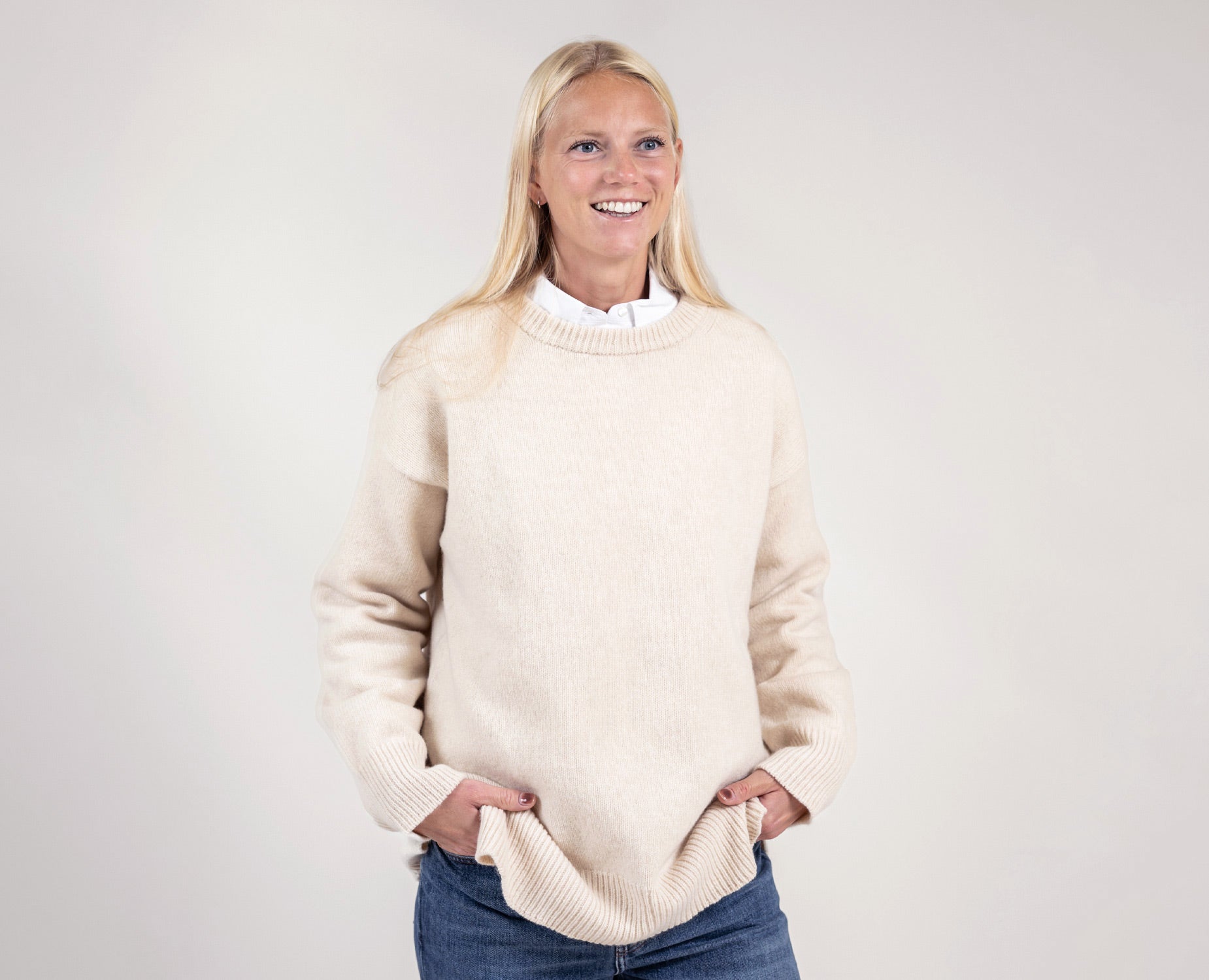 A slightly oversized, crew neck knitted sweater in the softest lambswool, a natural product that is both recyclable and biodegradable. The yarn in the Lou Sweater is made in the UK and comes entirely from healthy sheep that have not been subjected to mulesing. The sweater is in a straight model with open ends in the side seams for a more elegant fit. Turn-down sleeves with 2x2 rib. The Lou Sweater is available in Cherry Blossom, Ivory and Light Blue.
