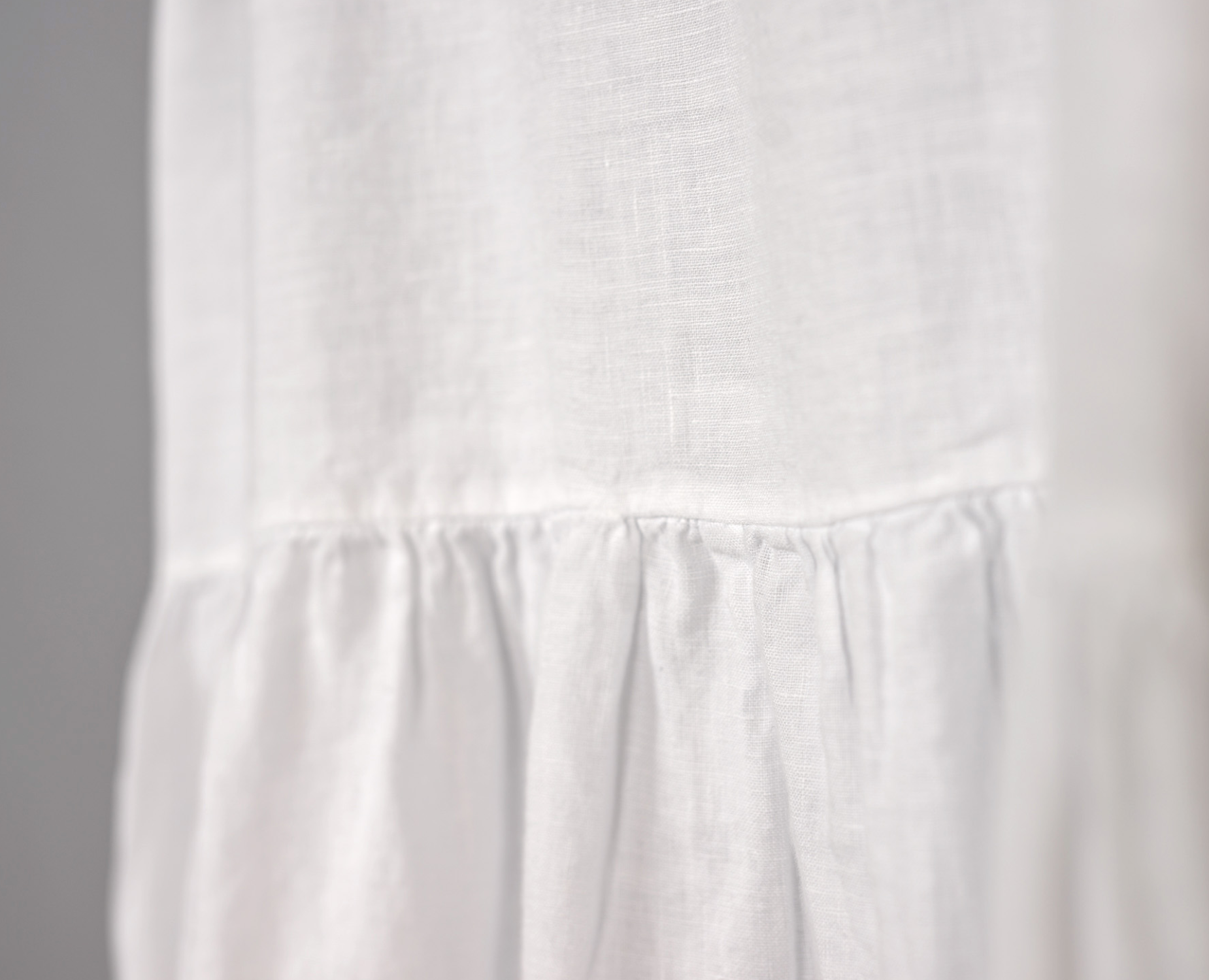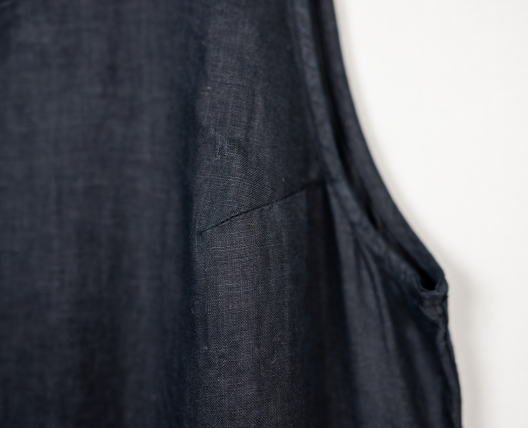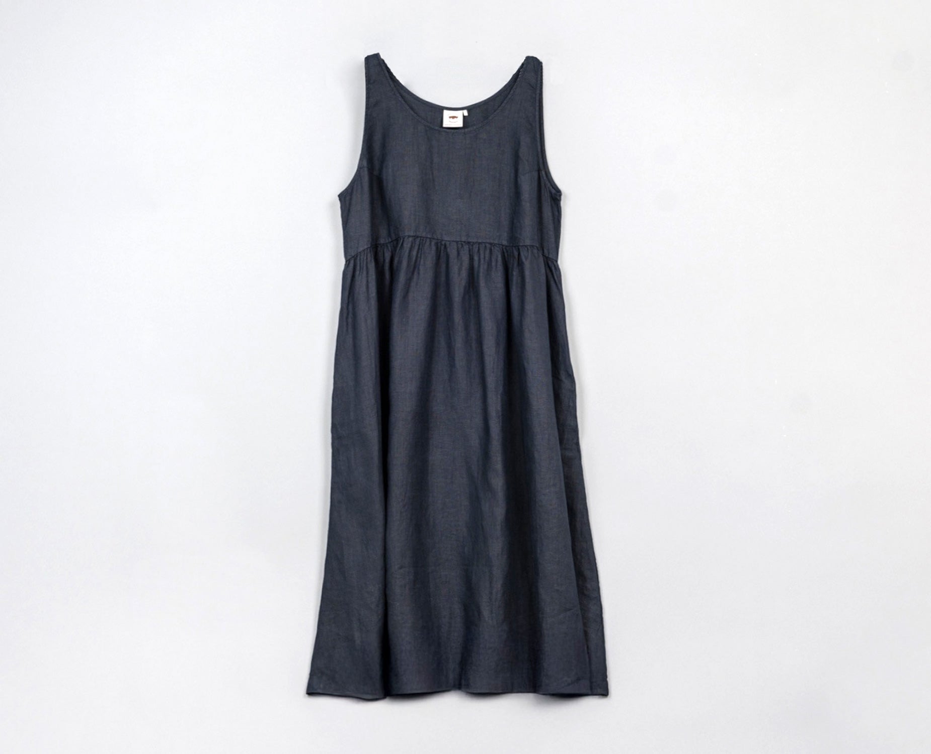Ärmlös klänning tillverkad av 100 % linne. Designad med en generös, avslappnad passform med praktiska sidofickor. Klänningen har en veckad söm som ger subtil volym och form till silhuetten. Den kan bäras för sig själv eller som ett lager på lager för en mer elegant look, vilket gör den till ett mångsidigt alternativ för både avslappnade och mer uppklädda tillfällen.