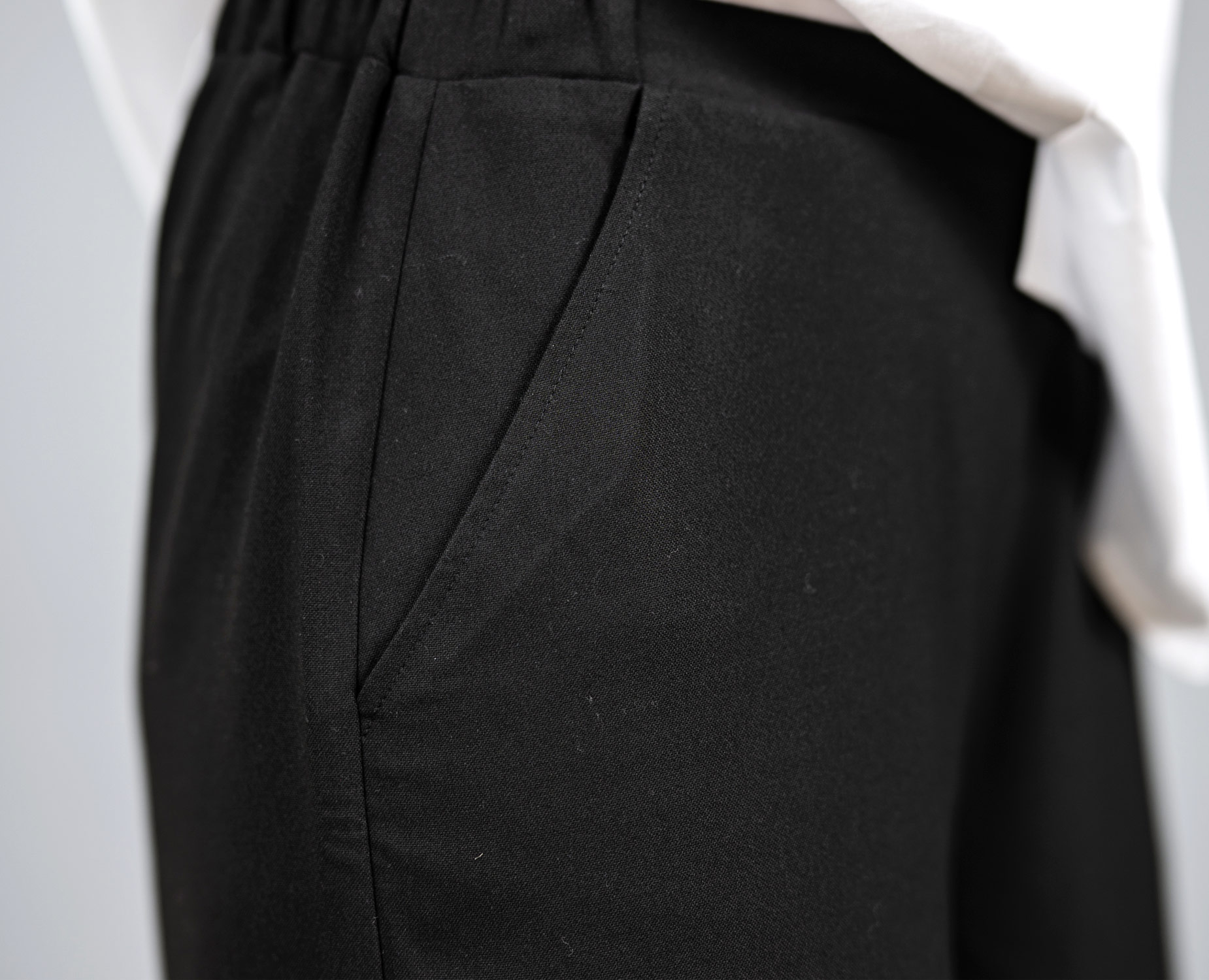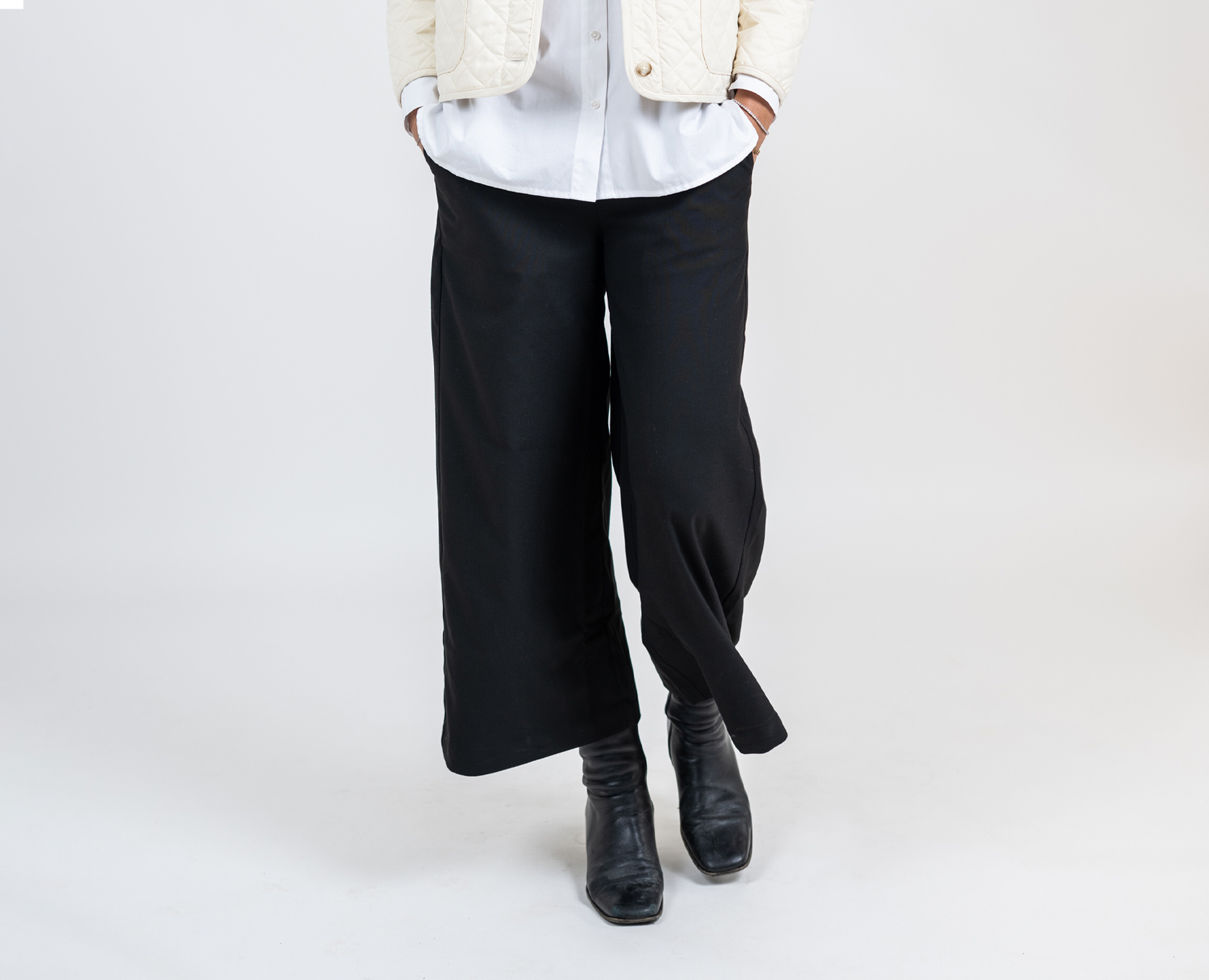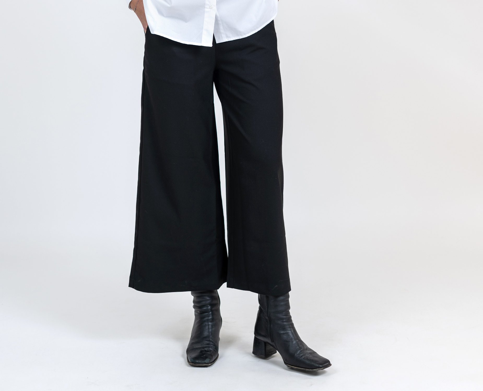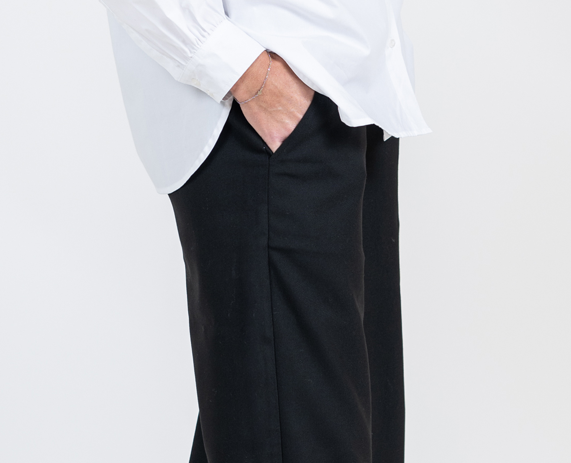 Bekväma byxor med avslappnad passform och vida ben för att lätt kunna röra sig i. De har en elastisk midja baktill för en flexibel och bekväm passform, medan framsidan hålls slät för en ren look. Tillverkade med två praktiska sidofickor. Den vida bensilhuetten ger en modern form och passar bra till både avslappnade och mer uppklädda kläder. Passar oavsett om man är hemma, på jobbet eller på språng. Producerad i Turkiet.
